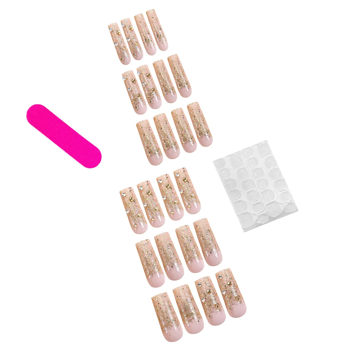24Pcs Gold Ballet False Nails Long Coffin with Rhinestone French Wearable Fake Nail Transparent Decoration Press on Nail Tips