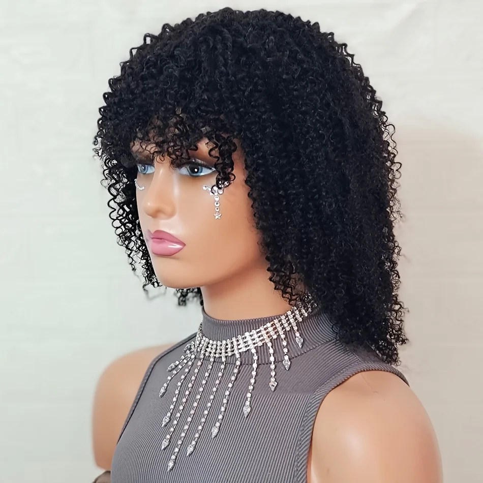 4A Afro Kinky Curly Wig With Bangs Human Hair 12/14 inch Short Curly Hair Wigs 180% Density Full Machine Made Natural For Women
