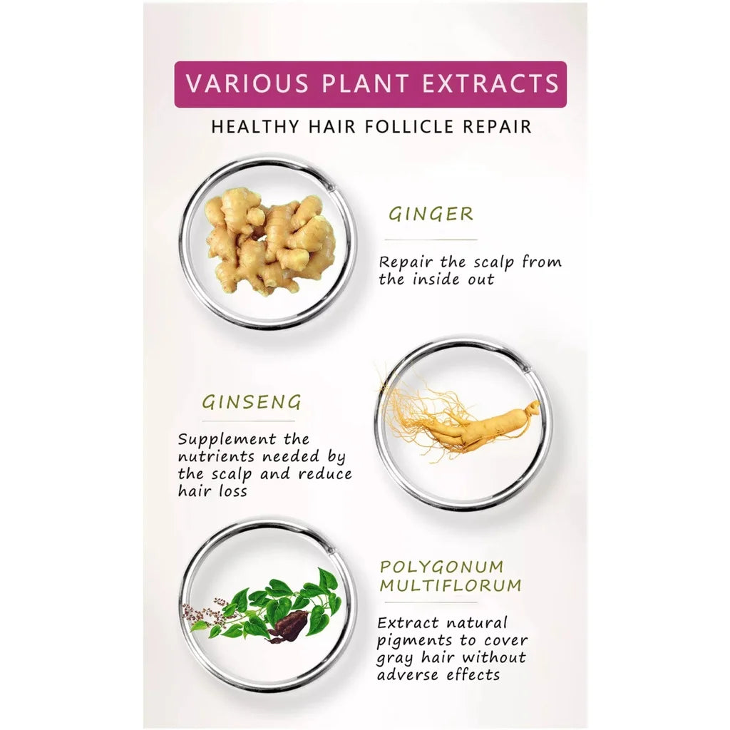 Newest formula of pure ginger bring back a completely new different experience for hair. Natural Ginger extract,Collagen,and ginkgo biloba essence help to strong the hair fibers from inside to out. After washing the hair will be more shiny ,soft and smooth, good for preventing losting hair, and repair the hair from root.Fastly hair dye black for women and men.